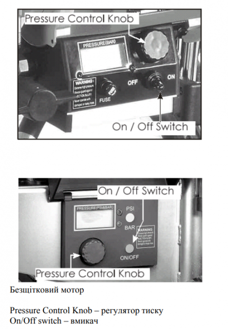 Розблокуйте пусковий пристрій пістолета та натисніть його. Перемістіть перемикач ON-OFF у положення "ON" (увімкнено) і поверніть регулятор тиску за годинниковою стрілкою лише настільки, щоб запустити насос.