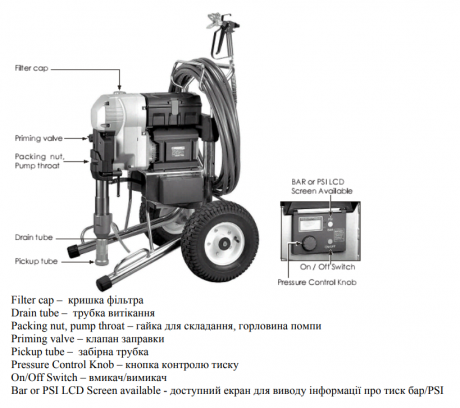 Додаткова інформація: Пристрій оснащений спеціальною системою контролю, що регулює витрату матеріалу та захищає розпилювач від перевантажень. Габарити, мм: Довжина 515 мм