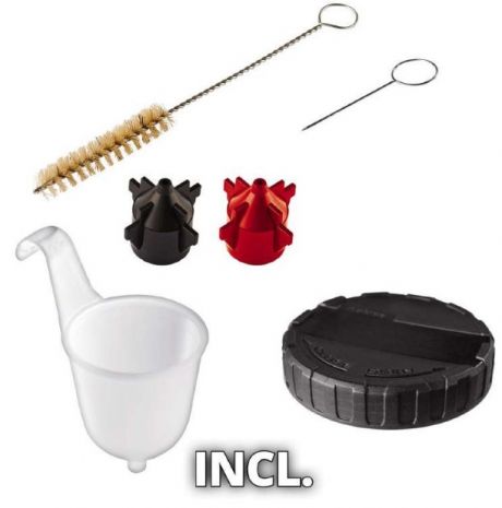 Съемная головка краскопульта аккумуляторного Einhell TC-SY 18/60 Li-Solo позволяет легко изменить краску, а также очистить все элементы, вступающие в контакт с краской. В комплект поставки входят два сопла для различной вязкости лака и глазури и емкость для исследования вязкости, очищающая щетка, игла для очистки, а также контейнер для краски с измерительной шкалой емкостью 800 мл с крышкой. Поставляется с Power X-Change аккумулятором 18V 2,5Ah и зарядным устройством.