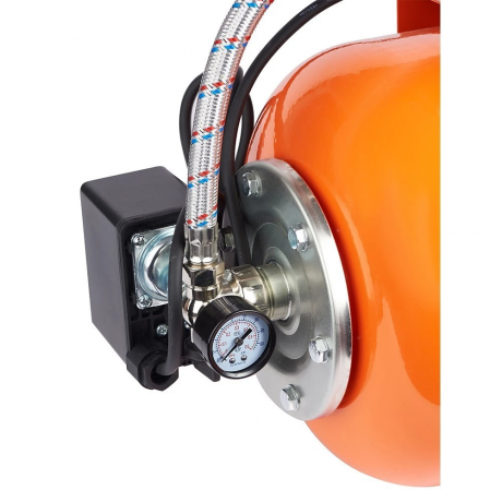 Насос працює у парі з гідроакумулятором. Гідроакумулятор – бак для зберігання води під тиском, який допомагає підтримувати постійний тиск у системі та зменшує частоту включень насоса, що значно впливає на термін служби агрегату. Манометр служить для візуального контролю тиску в системі