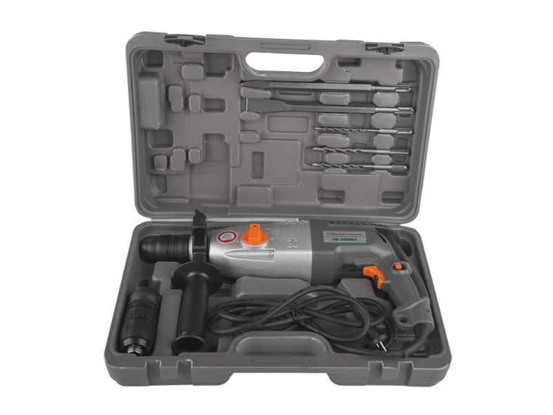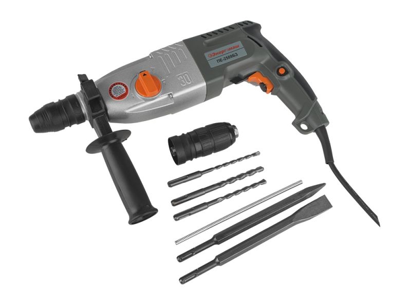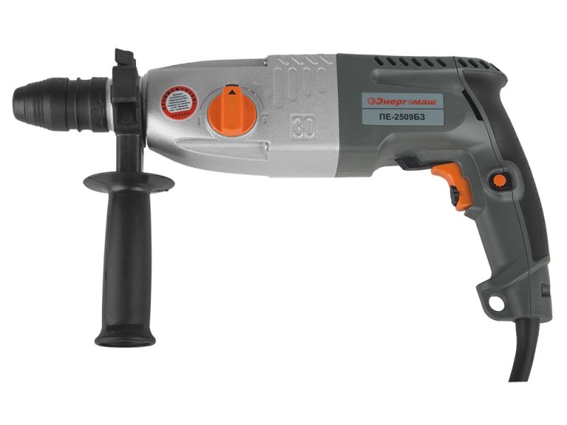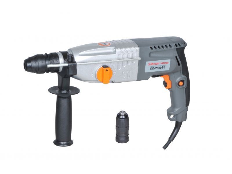 Перфоратор ЭНЕРГОМАШ ПЕ-2509БЗ - мощный, производительный, удобный и простой в управлении инструмент бытового уровня. С помощью инструмента можно выполнять широкий спектр работ - сверлить отверстия в различных материалах - металле, древесине или пластике, а также в кирпичной кладке или бетоне в режиме сверления с ударом или долбления. Металлический корпус редуктора перфоратора защищает узлы и механизмы от механических воздействий, улучшает теплоотдачу и уменьшает возможность перегрева. Хорошее качество сверления и продление срока жизни инструмента за счет отсутствия биения достигается использованием быстросъемного патрона без переходника. Съемная дополнительная рукоятка перфоратора дает возможность удобно работать двумя руками.