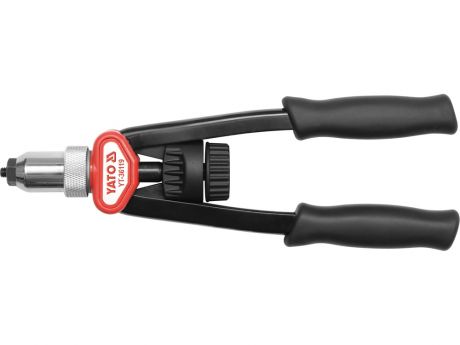 Заклепник для нарізних заклепок застосовується у кріпильних роботах для міцного з'єднання матеріалів нарізними заклепками М5, М6, М8, М10, М12. Виготовлений із високоякісної хром-ванадієвої сталі. Використання нарізної заклепки, на відміну від звичайної, дає можливість міцно скріплювати тонколистові матеріали, замикаючи їх між собою. Продумана конструкція пістолета для нарізних заклепок забезпечить легке та швидке виконання операцій. Металева ручка з гумовими накладками для зручного використання. До комплекту входить: кейс і 5 заклепок із різзю М5, М6, М8, М10, М12.